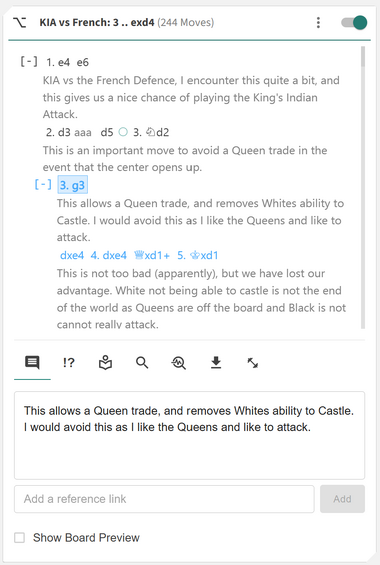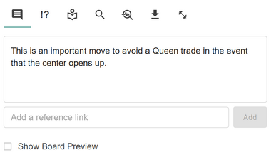 Add written commentary to any move to provide explanation, reminders, or reference links. You can include personal insights, theoretical notes, or even external URLs — for instance, a link to a Lichess game or a course reference. All links are clickable directly in the Move Display for seamless navigation.