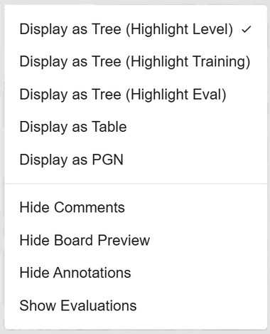 - ◦ Display as Tree (Highlight Training): Highlights moves based on your training performance — green indicates strong positions, and red highlights weaker areas needing extra attention.