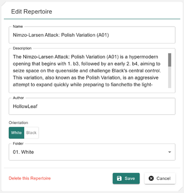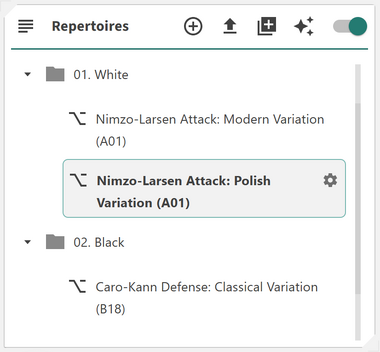The Repertoire Card introduces a folder-based approach to repertoire management. You can create, rename, and delete folders; assign colors to them for easier visual grouping; and drag-and-drop both folders and repertoires to nest them within each other. You can also click on folders to collapse or expand them, making it easier to navigate large repertoires. Clicking on a repertoire will load it directly in the Builder, and a configuration button will appear on the right-hand side, allowing you to adjust your repertoire settings. Right-clicking on a folder or repertoire opens a context menu, giving you quick access to options such as renaming, recoloring, or deleting.