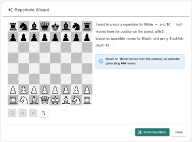 Once configured, the wizard will display an estimated number of moves that will be created based on your selected parameters, click Build Repertoire to let the wizard build a full move tree based on your settings. You can preview the generated repertoire before saving it permanently, or click Cancel at any time to discard the results and keep what has already been generated.
