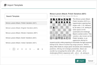 The Import Template feature provides access to a large collection of pre-generated repertoires that you can use as a foundation for your own study and customization. This is designed to help you kick-start your repertoire journey with professionally evaluated move trees.
