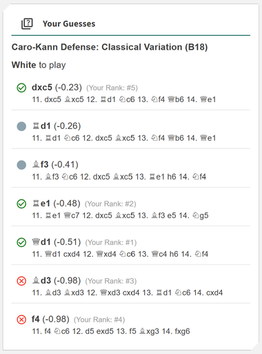 This visual feedback allows you to instantly see how your candidate moves compare to engine preferences and reinforces pattern recognition through repetition.