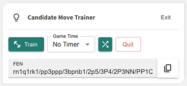 The Candidate Move Trainer presents you with a position from your repertoire (or Custom FEN) and challenges you to calculate the strongest candidate moves. Your answers are evaluated against Stockfish analysis, helping you improve your move selection, deepen your calculation ability, and sharpen your instincts for identifying the best options in critical positions.