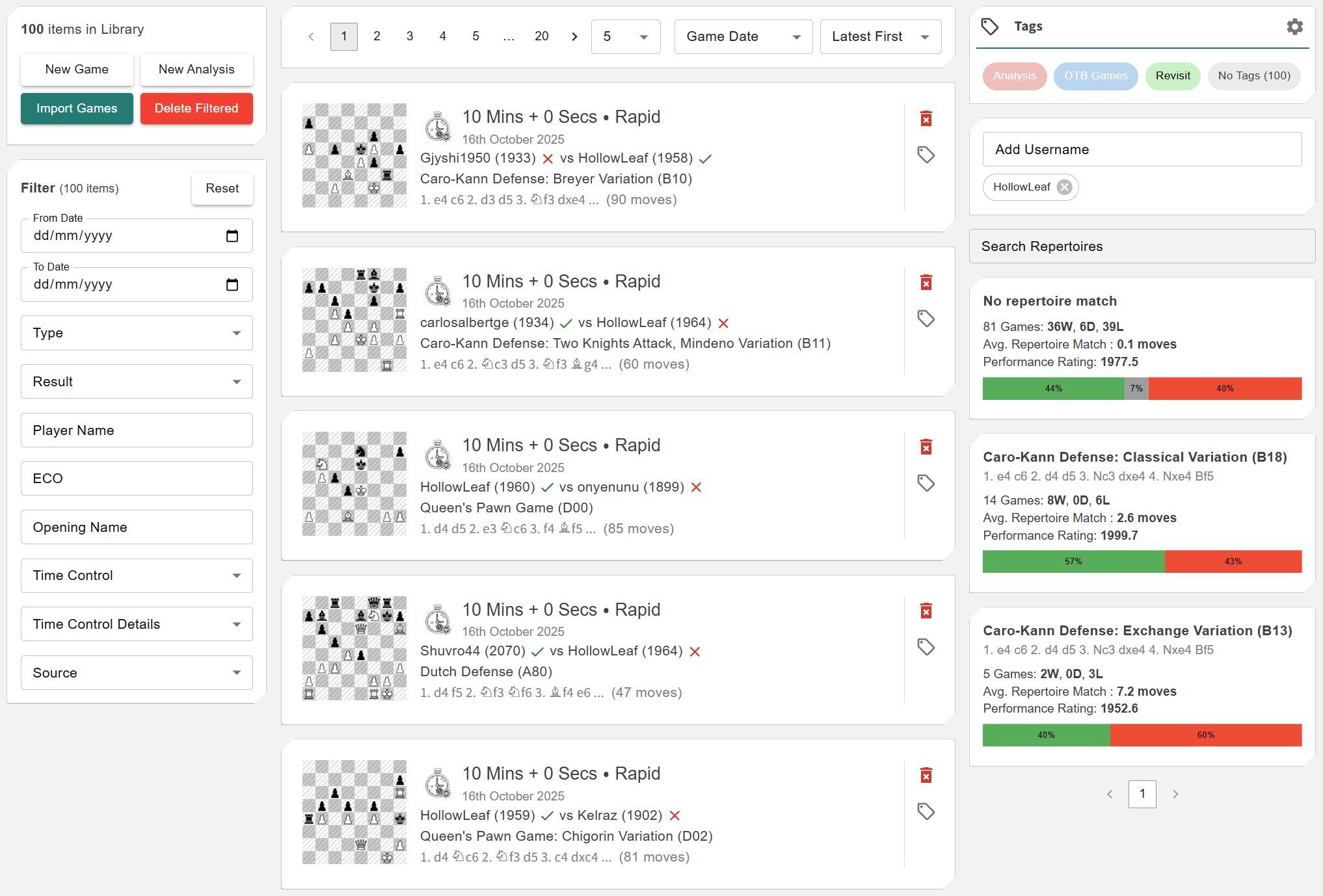 Use the Filters to quickly narrow down your games — by result, color, date range, opening, or other criteria. For larger collections, use the pagination controls at the bottom of the Library to move between pages of results efficiently.