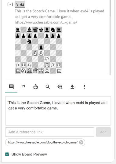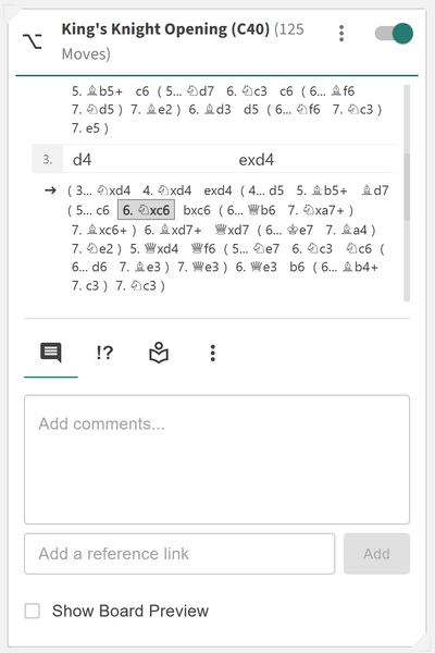 Experiment by selecting any move, adding a short comment, and entering a reference link — for example, to a Lichess study or YouTube analysis. Then toggle the Board Preview on and off to see how it enhances your ability to review positions directly from the Moves Card.