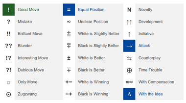 - ◦ Position Annotations — Indicate the evaluation of the position, such as White is better, Black is winning, or Equal.