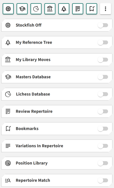 - • Hide / Show Evaluations — Toggles the visibility of evaluation values across your repertoire.