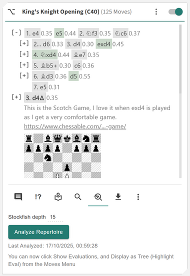 Once your repertoire is built and annotated, you can take it a step further by analyzing it with the integrated Stockfish engine to gain objective evaluations.