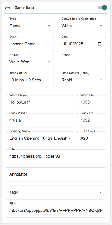 Info: If the metadata exists within the imported PGN, these fields will be automatically populated when the game is loaded into the platform. This saves time and ensures consistency with the original game data.