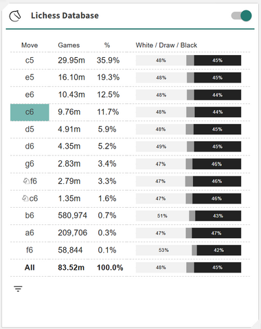 For the current position, this section displays the most common next moves, highlighted in green if they already exist in your opened item, along with the number of games, the percentage of games where each move was played, and the Win–Draw–Loss (WDL) percentages based on all rated games in the Lichess database.
