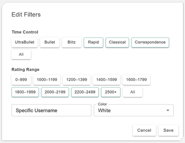 - ◦ Time Control: Focus on games from particular formats such as blitz, rapid, or classical