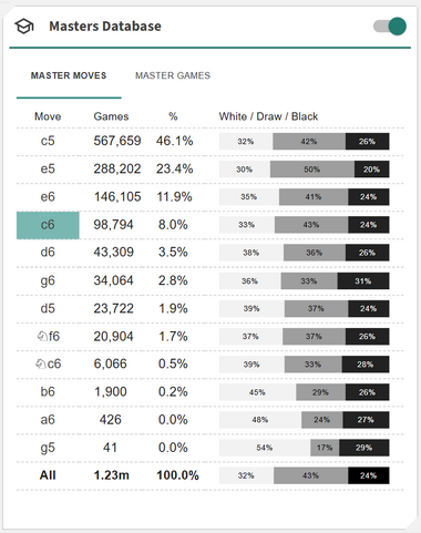 The Masters Database, powered by Lichess, provides high-quality opening statistics based exclusively on games played by titled players. Within the Repertoire Builder, this card offers deep insights into how masters handle the current position, allowing you to study professional practice and strengthen your repertoire with proven lines.