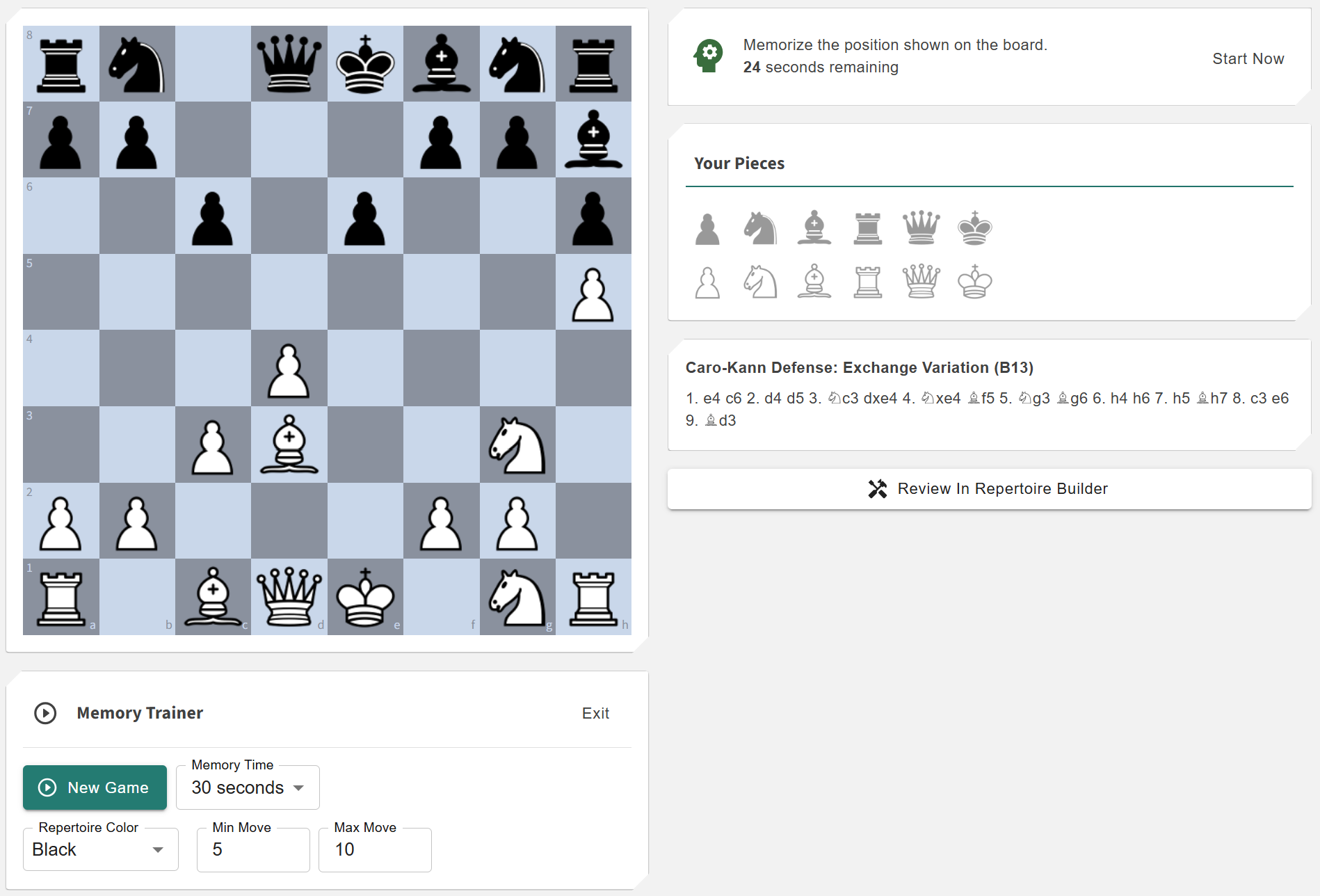 Choose how long you want to study the position, the repertoire colour (White or Black), and the ply range to draw from. Click New Game to start the countdown and focus on memorising the layout.