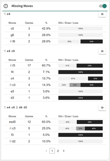 The card scans all the moves in your repertoire and compares them against the reference tree, listing any missing continuations beyond the current position, along with alternative moves available in the reference. For each move, you can view the number of games and the win–draw–loss (WDL) percentages. You can click on a line or arrow to navigate directly to that position, or click on a missing move to add it instantly to your repertoire.
