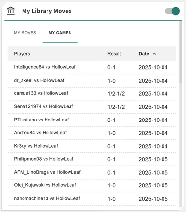 The My Library database acts as a personal reference built entirely from your own saved games, imported studies, and analysis files. Within the Repertoire Builder, this card lets you compare the current position against your Library material, showing how you or others have reached or analyzed the same position in the past. It’s a powerful way to reuse your own work, reinforce your repertoire, and maintain consistency across your study material.