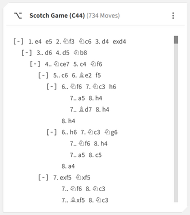 The Moves Card is displayed once a training session is complete, allowing you to review the line and analyze your results in detail. It provides additional insights and visualization tools to enhance your study experience. In the top-right corner of the Moves Card, you’ll find a menu allowing you to: