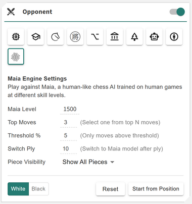 - ◦ Maia Level: Choose from rated models (e.g., 1100, 1500, 1900) based on how strong and human-like you want the opponent to be