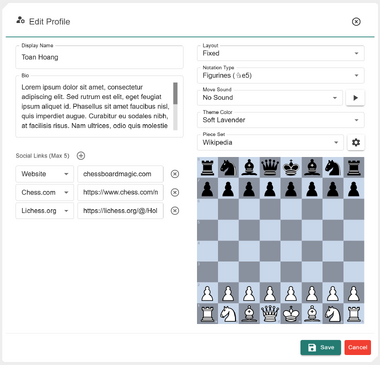 The Profile / Preferences area allows you to customize your Chessboard Magic experience in detail — from visual themes and notation styles to layout preferences and personal profile information. You can access it from anywhere in the application by clicking on the Profile Icon in the top-right corner