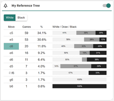 For the current position, the card displays all possible moves found in the reference tree, along with their number of games, percentage of games played, and win–draw–loss (WDL) percentages. Moves that already exist in your opened item are highlighted in green, making it easy to spot overlaps at a glance. You can click on any move to add it directly to your opened item, and use the side toggle to switch between the white or black perspective.
