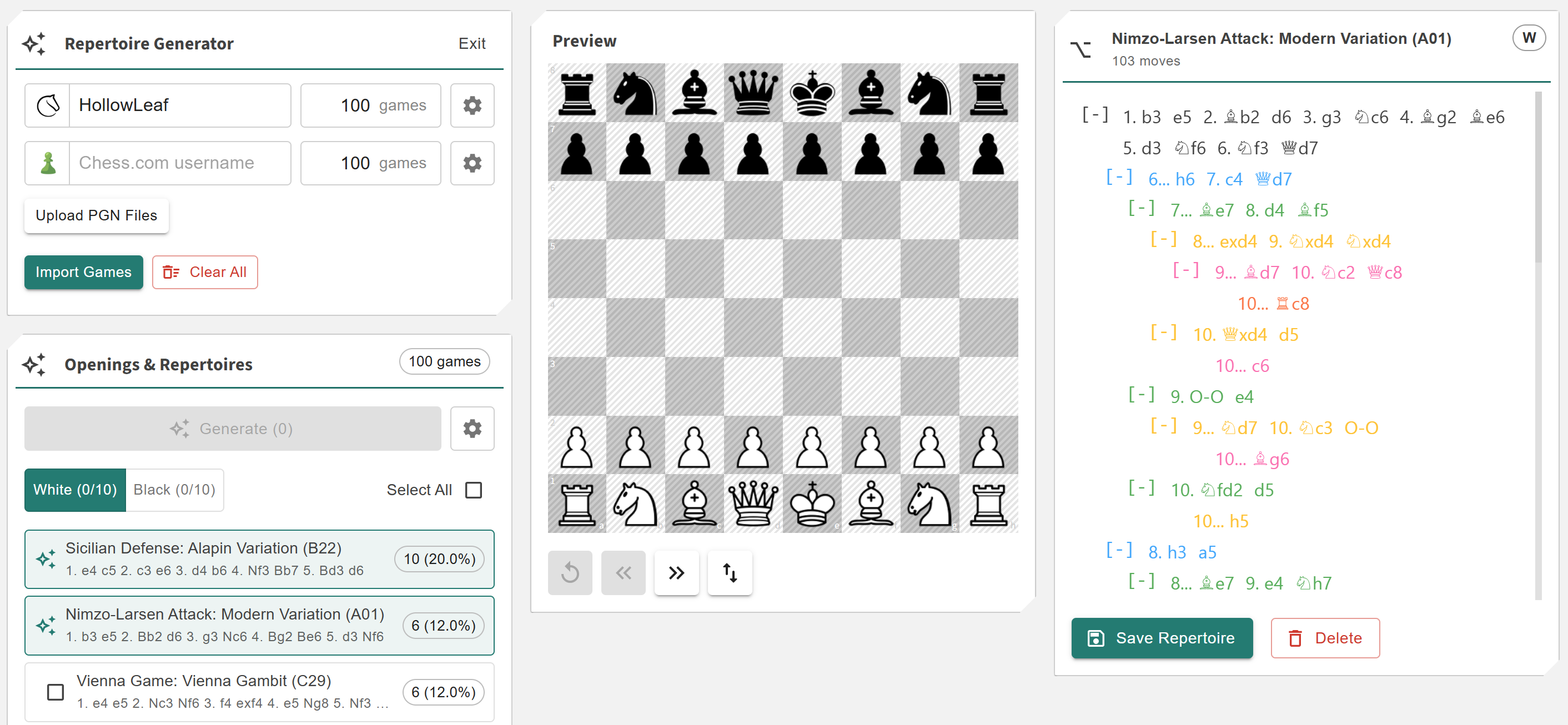 The Repertoire Generator allows you to import your games from Chess.com, Lichess.org, and your own PGN files to automatically generate engine-approved repertoire templates. These templates can then be loaded directly into the Repertoire Builder, allowing you to rapidly create custom repertoires that are grounded in your actual gameplay rather than generic theory.