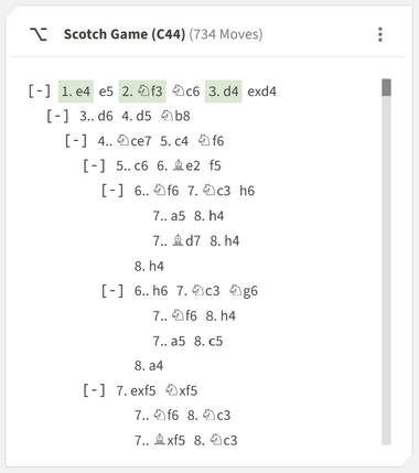 The Moves Card appears at the end of each training sequence, allowing you to explore and analyze the line in full. You can toggle between line and tree views to visualize alternative branches and see how the current variation fits within your broader repertoire.