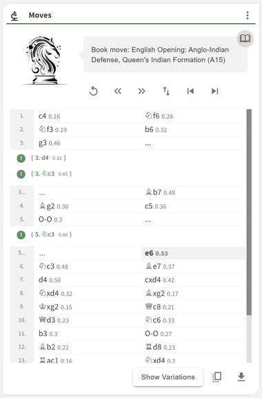 You can also navigate the game using the left and right arrow keys on your keyboard. At the bottom of the Moves Card, you may toggle the display of full variations at points where inaccuracies or worse occurred, giving you deeper insight into alternative lines. You can also copy the PGN or download it directly for later study or external analysis.