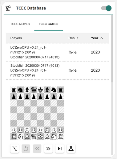 The TCEC Database provides cutting-edge opening insights based on thousands of engine-vs-engine games from the Top Chess Engine Championship (TCEC). Within the Repertoire Builder, this card helps you explore how the world’s strongest chess engines handle each position — revealing deeply optimized, computer-level continuations that often go far beyond human theory.