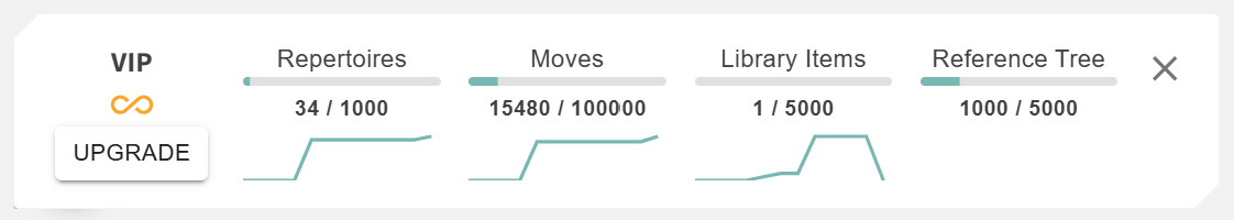 The Usage Statistics card provides a detailed overview of your current plan and platform usage. It helps you monitor your progress and manage your data limits for Moves, Repertoires, Library Items, and Reference Tree entries.