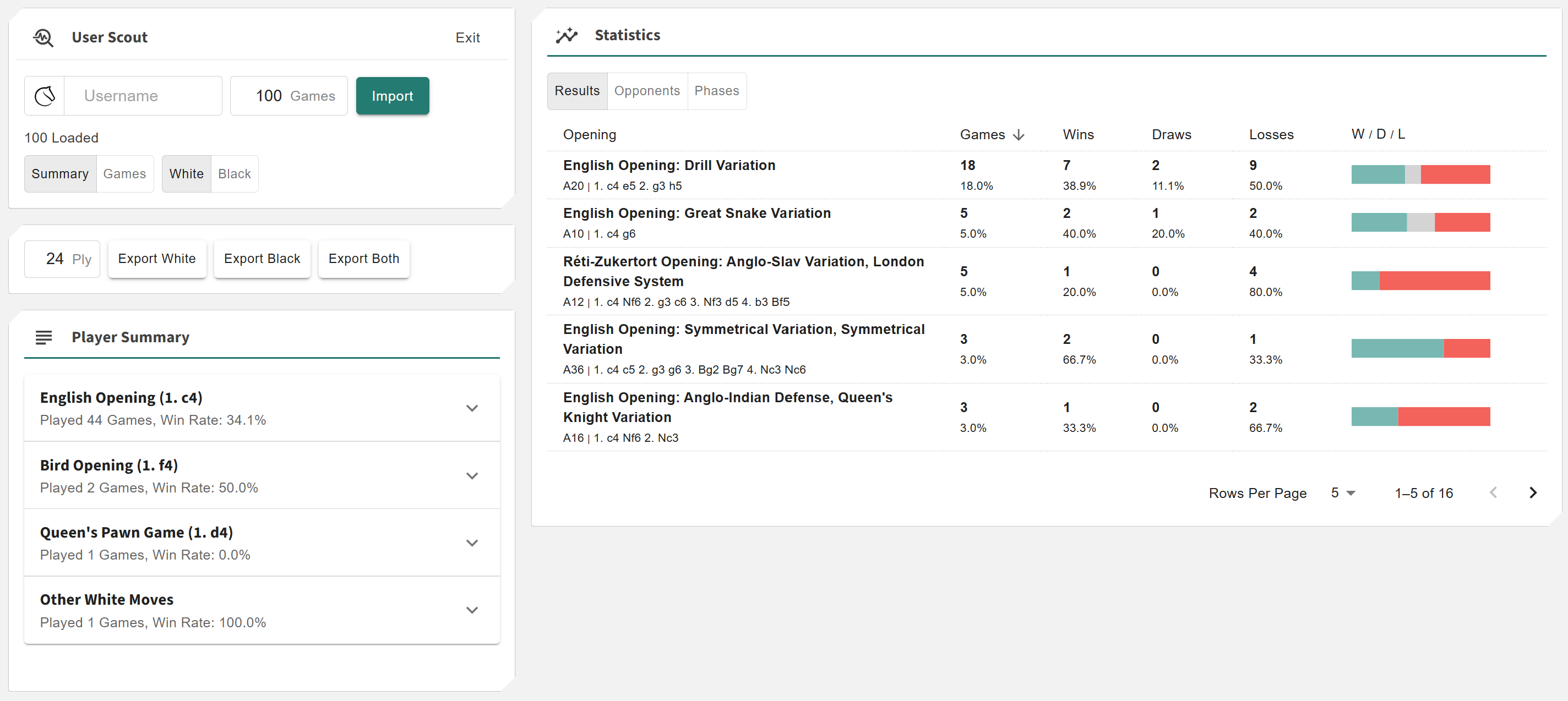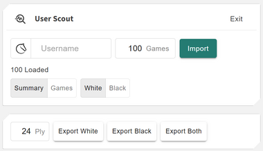 The User Scout tool lets you import games from Chess.com or Lichess and generates a complete analysis of the selected player. It builds a unified move tree from their games, highlights their most frequent openings, and provides insights into their strengths, weaknesses, and stylistic tendencies.