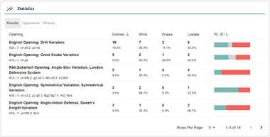 - ◦ Results: Displays opening names, lines, and detailed win–draw–loss counts with percentages. You can sort by any column to drill deeper into the player’s tendencies.