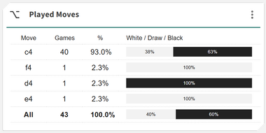 The Played Moves card shows all continuations available from the current position. Each move entry provides both frequency and performance data, helping you see how the player performs in specific lines.