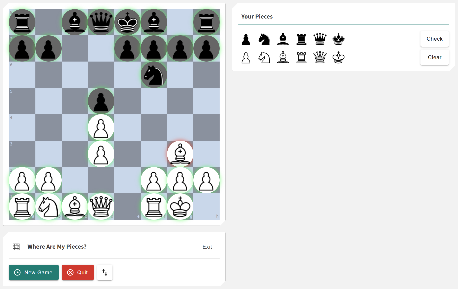 The Where Are My Pieces? puzzle shows you a position from your repertoire, but instead of pieces you see only blank circles on the board. Your task is to place the correct piece on each marked square. This exercise sharpens visualization and strengthens position recall from memory.